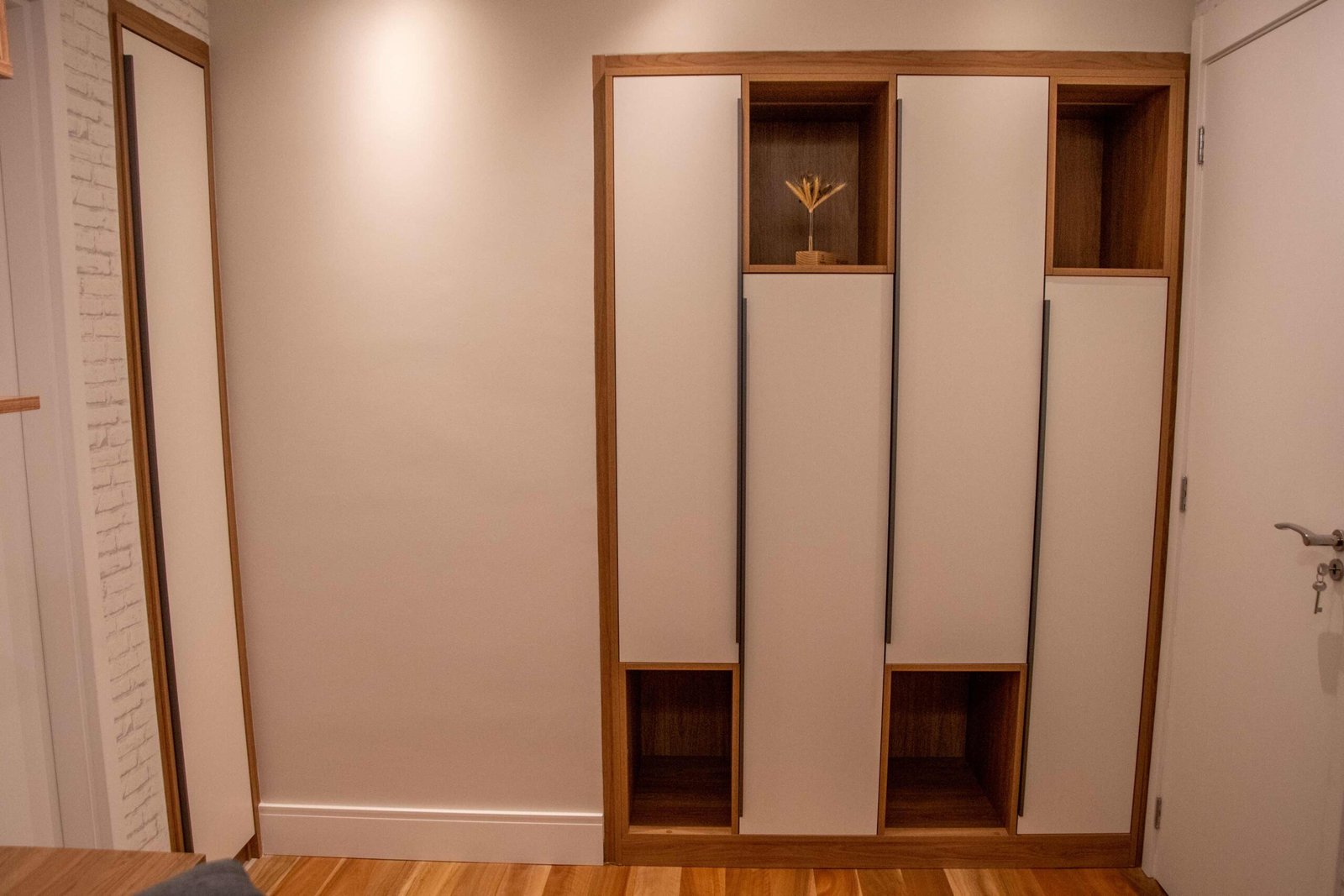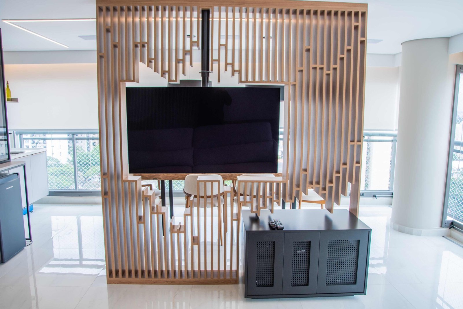 A escolha de materiais e cores foi pensada para transmitir leveza e sofisticação, com uma paleta de tons neutros que se harmonizam com elementos naturais, como madeira e detalhes orgânicos, criando uma sensação de conforto e equilíbrio. O projeto aposta em linhas modernas e soluções criativas para unir estética e praticidade, promovendo um espaço funcional sem abrir mão do estilo.