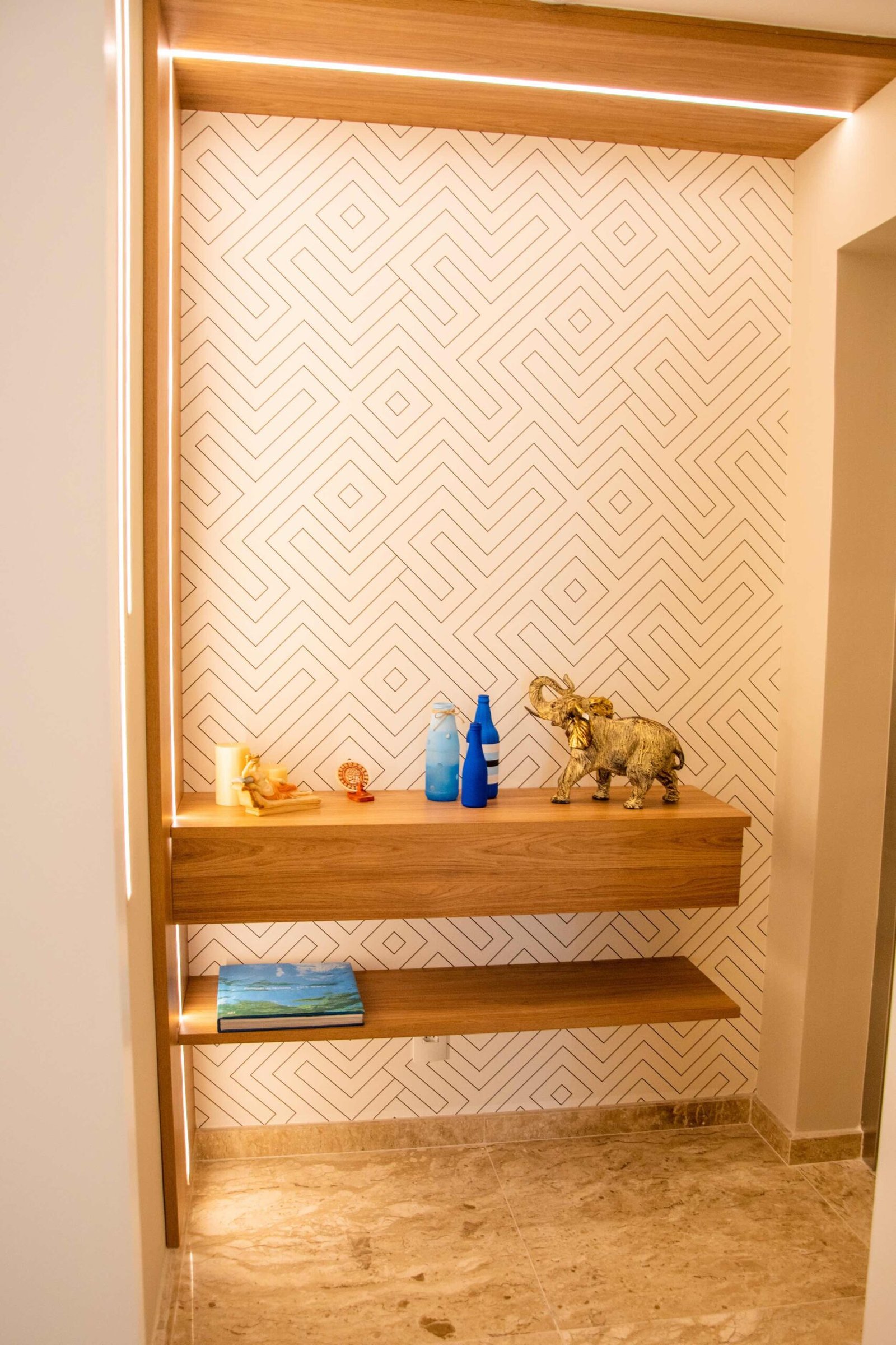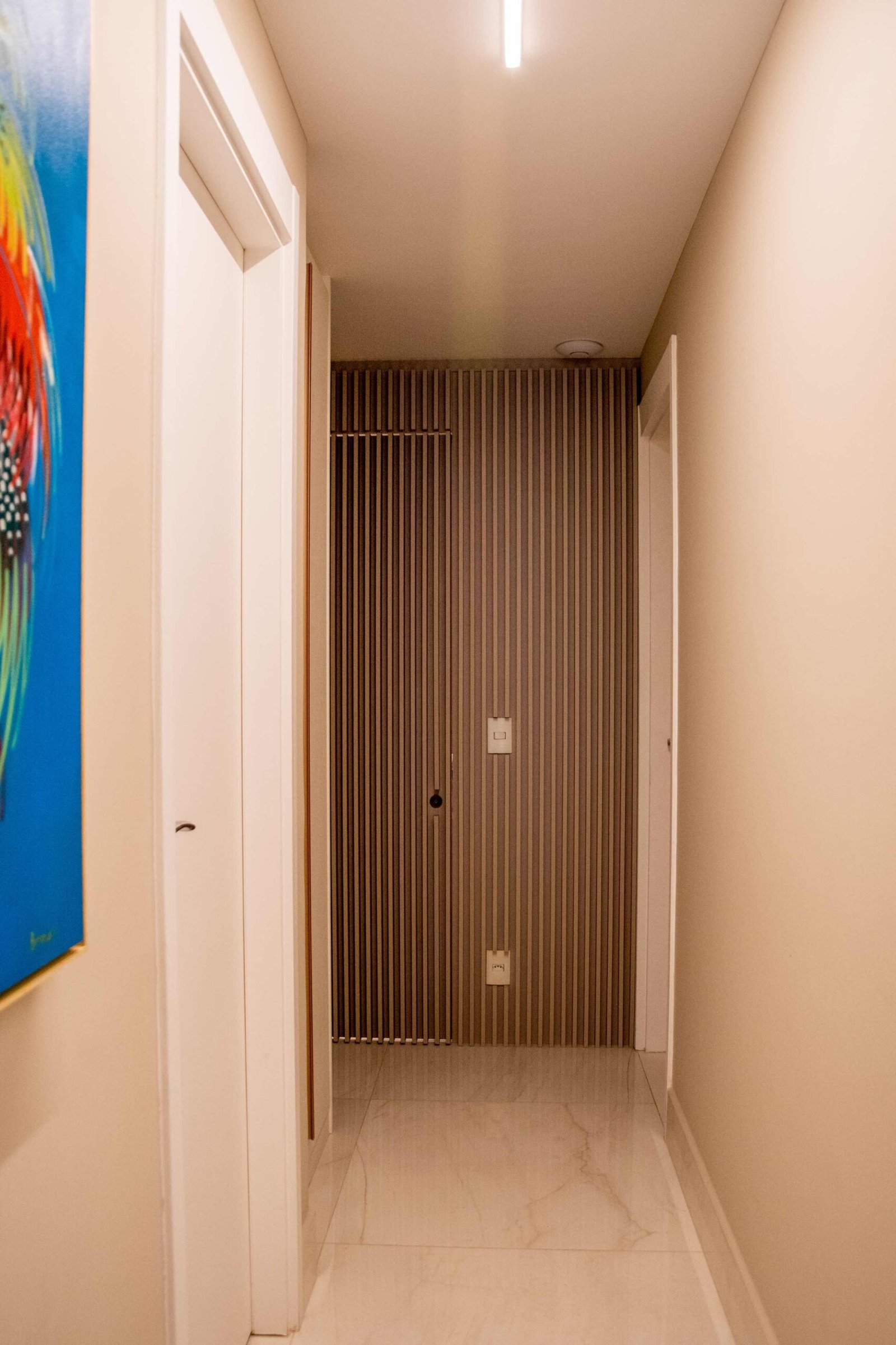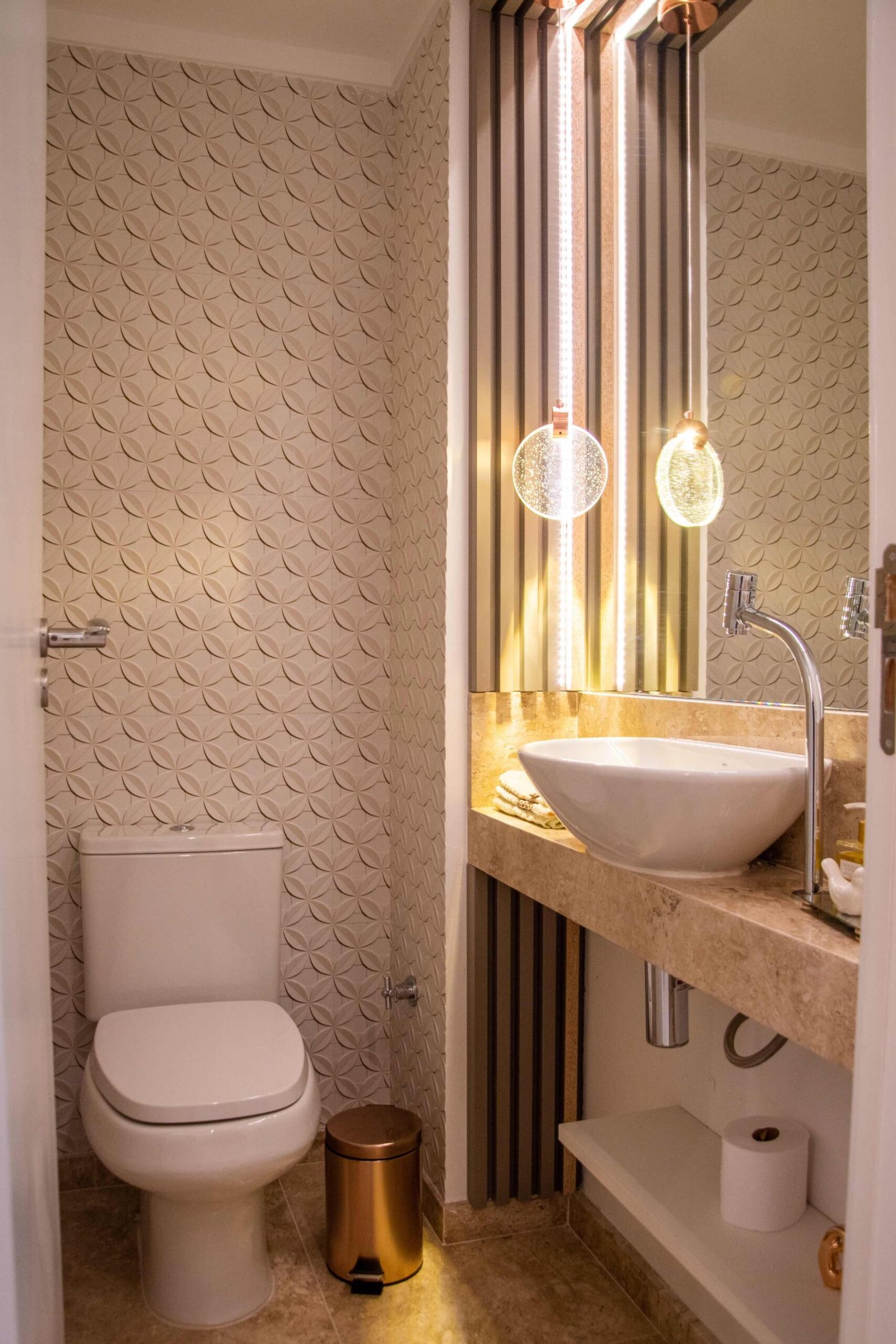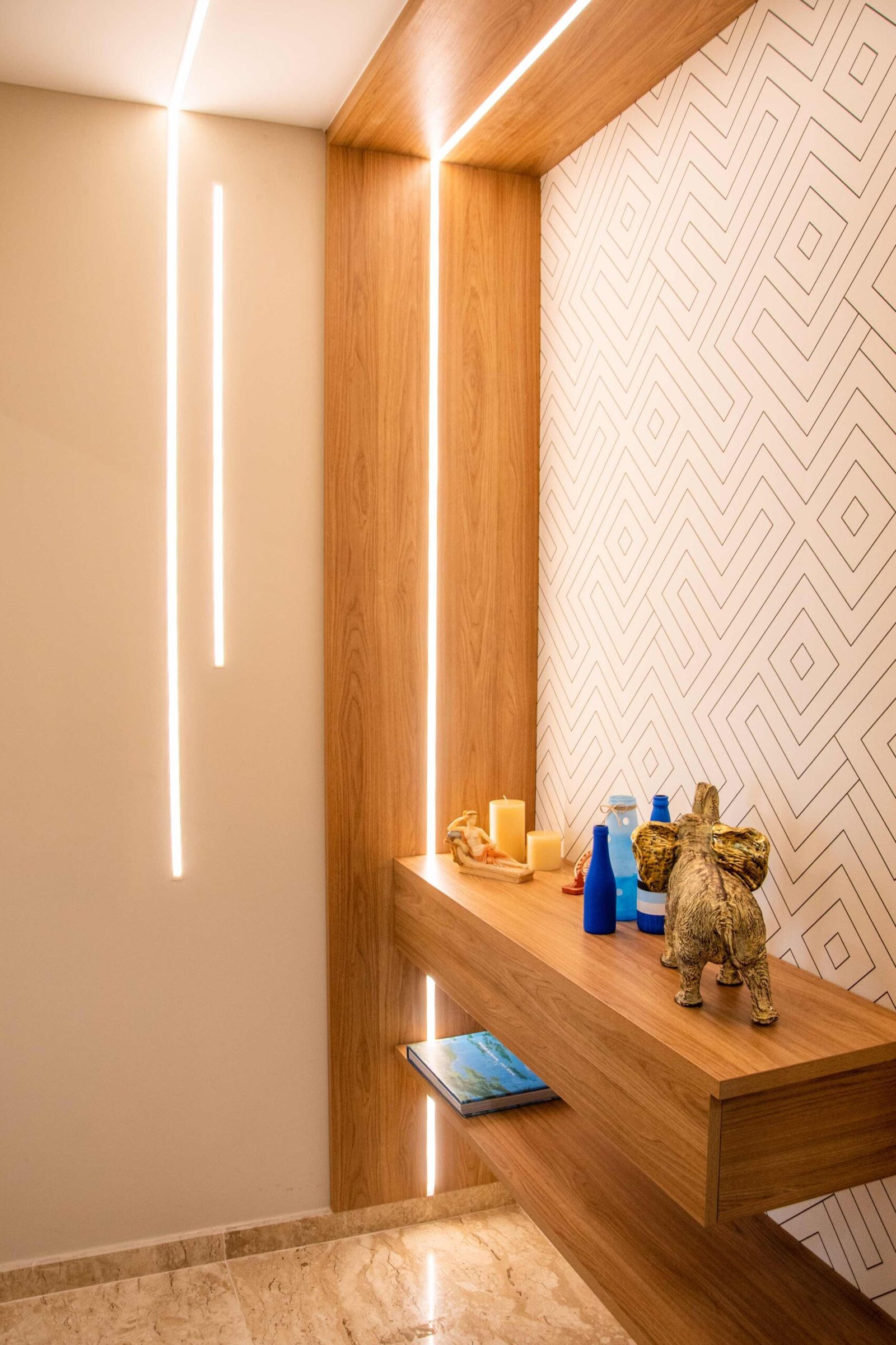 A iluminação, tanto natural quanto artificial, desempenha um papel essencial ao realçar os detalhes do projeto, valorizando os materiais e criando diferentes atmosferas ao longo do dia. Elementos decorativos pontuais, como texturas, nichos e detalhes verticais, adicionam personalidade ao ambiente sem sobrecarregá-lo, mantendo uma estética clean e sofisticada.